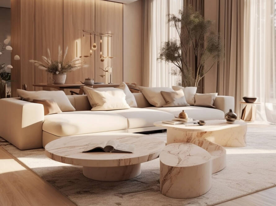 Finisajele mate și nuanțele de bej, gri deschis și lemn creează o atmosferă de zen modern, caldă și echilibrată.