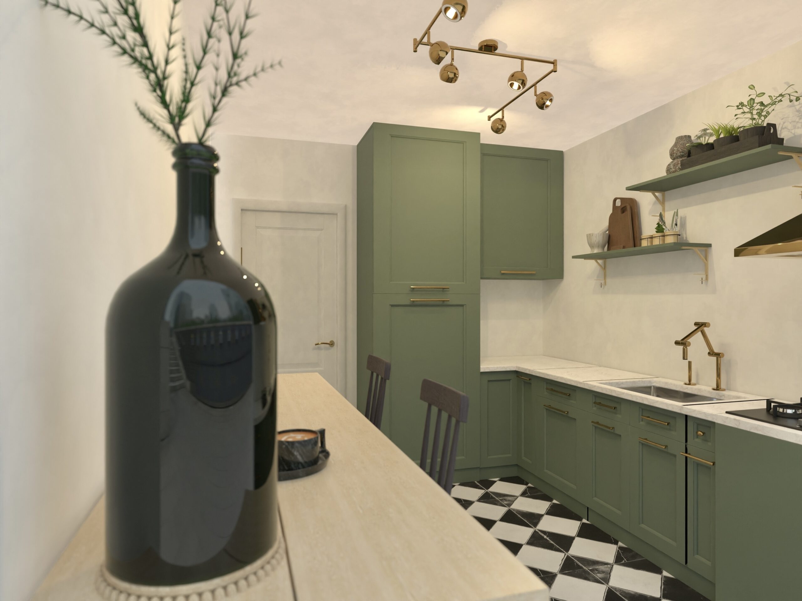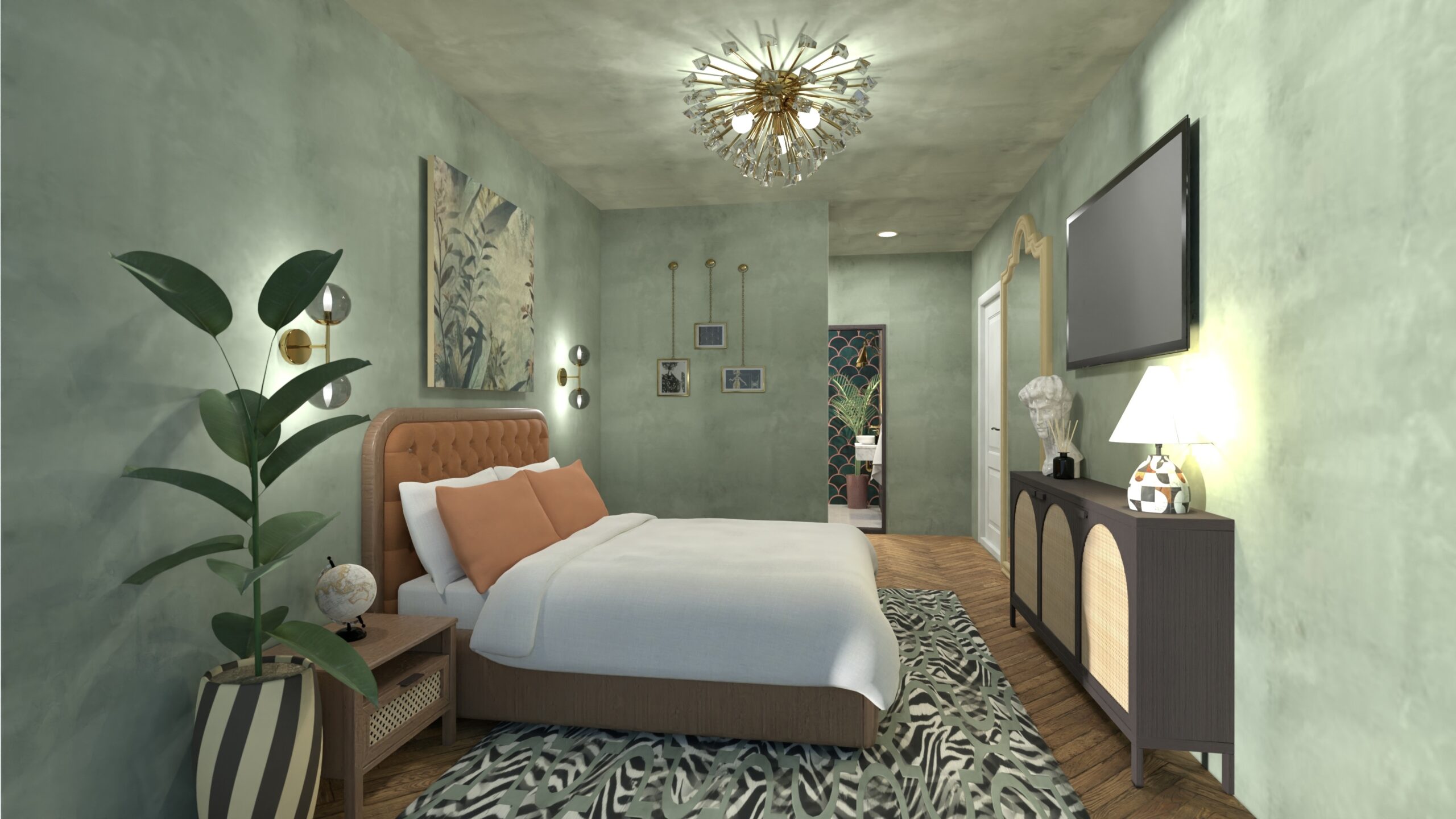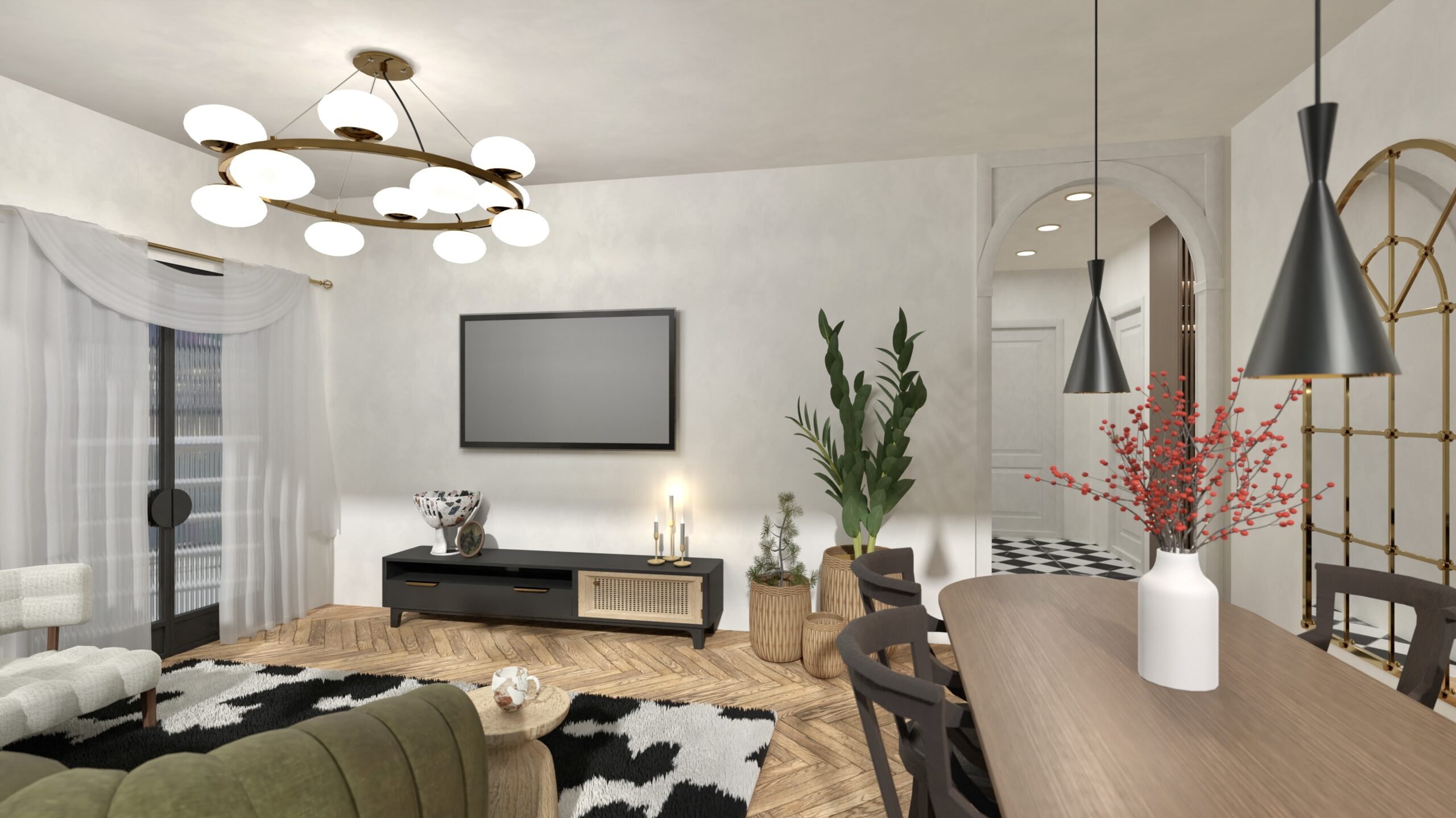 Rezultatul: un interior bogat în texturi, forme geometrice și accente aurii, dar cu o atmosferă caldă, primitoare.