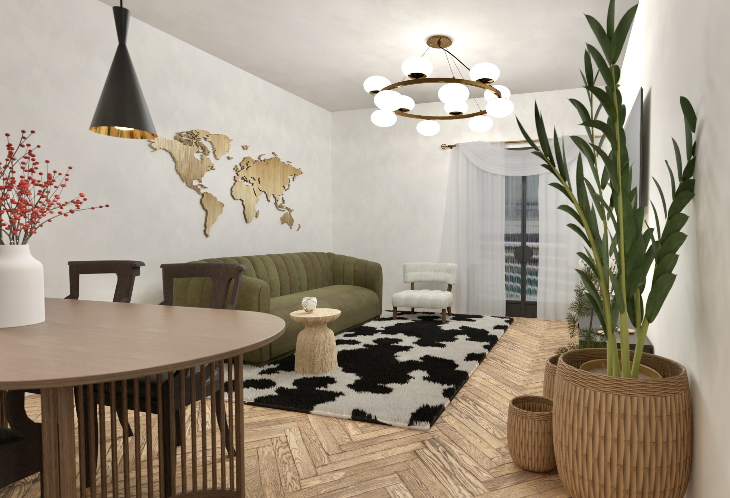 Canapeaua din catifea adaugă profunzime tactilă, iar masa de dining, cu formă sculpturală, devine punctul central al camerei.