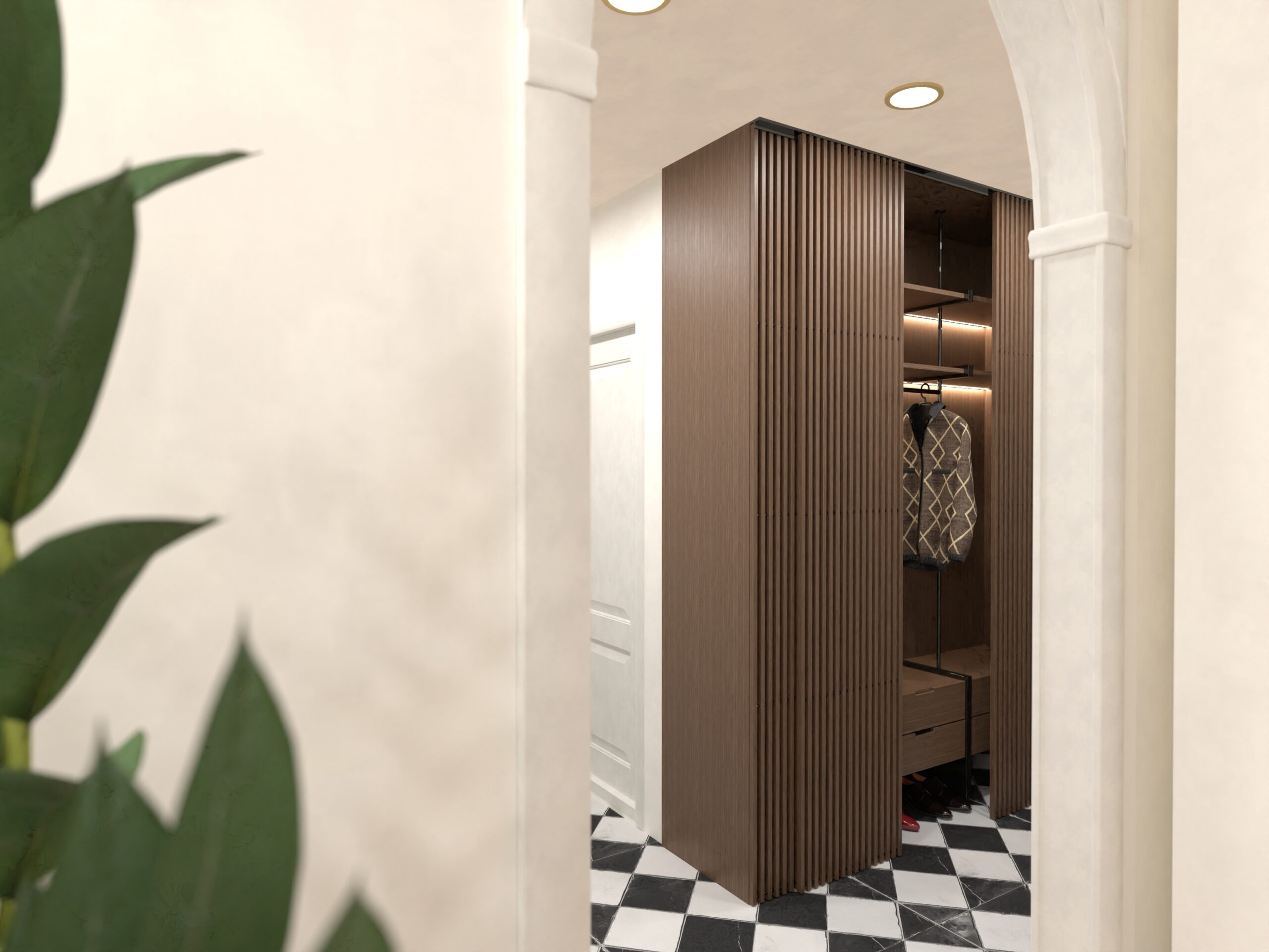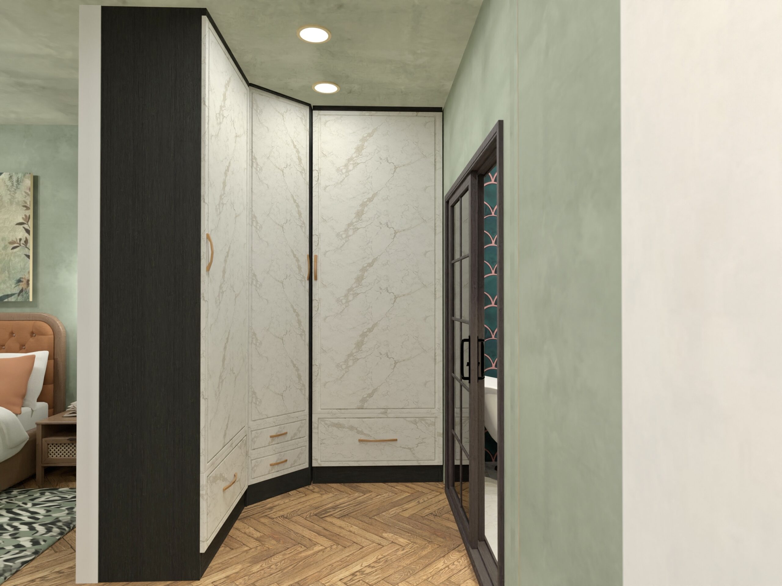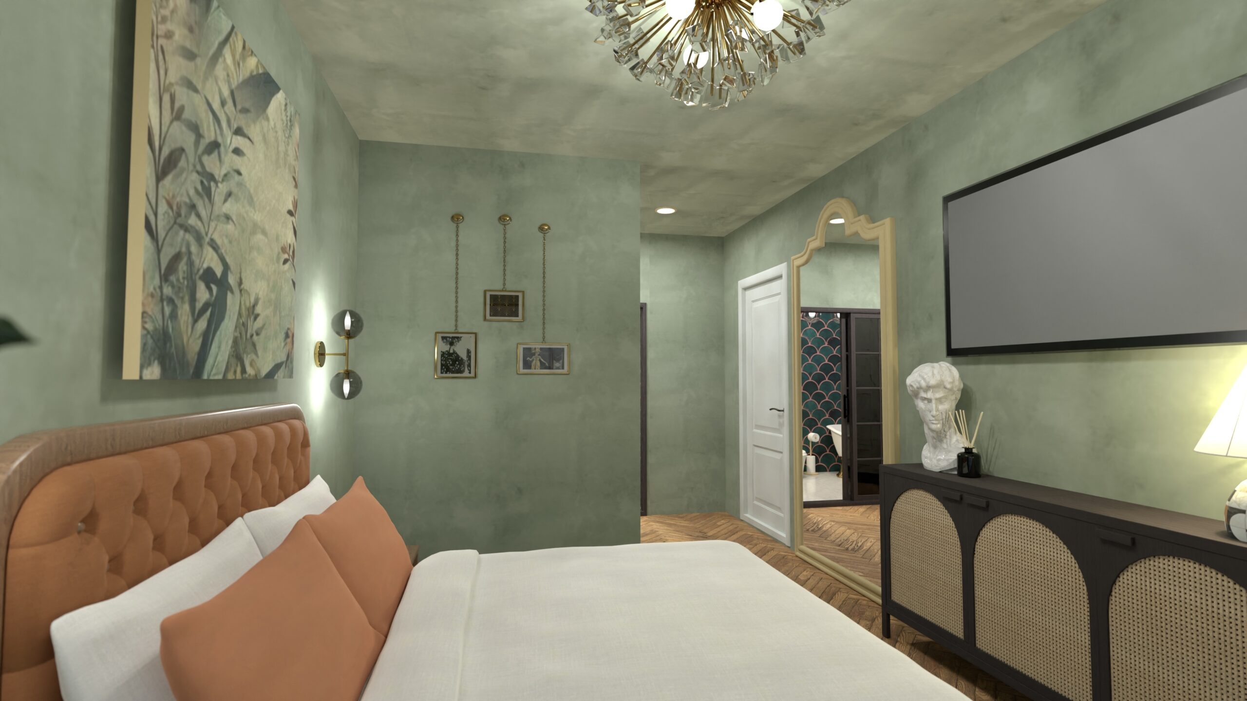 Oglinda aurie și vaza geometrică devin elemente-simbol, iar dressingul generos aduce funcționalitate discretă.