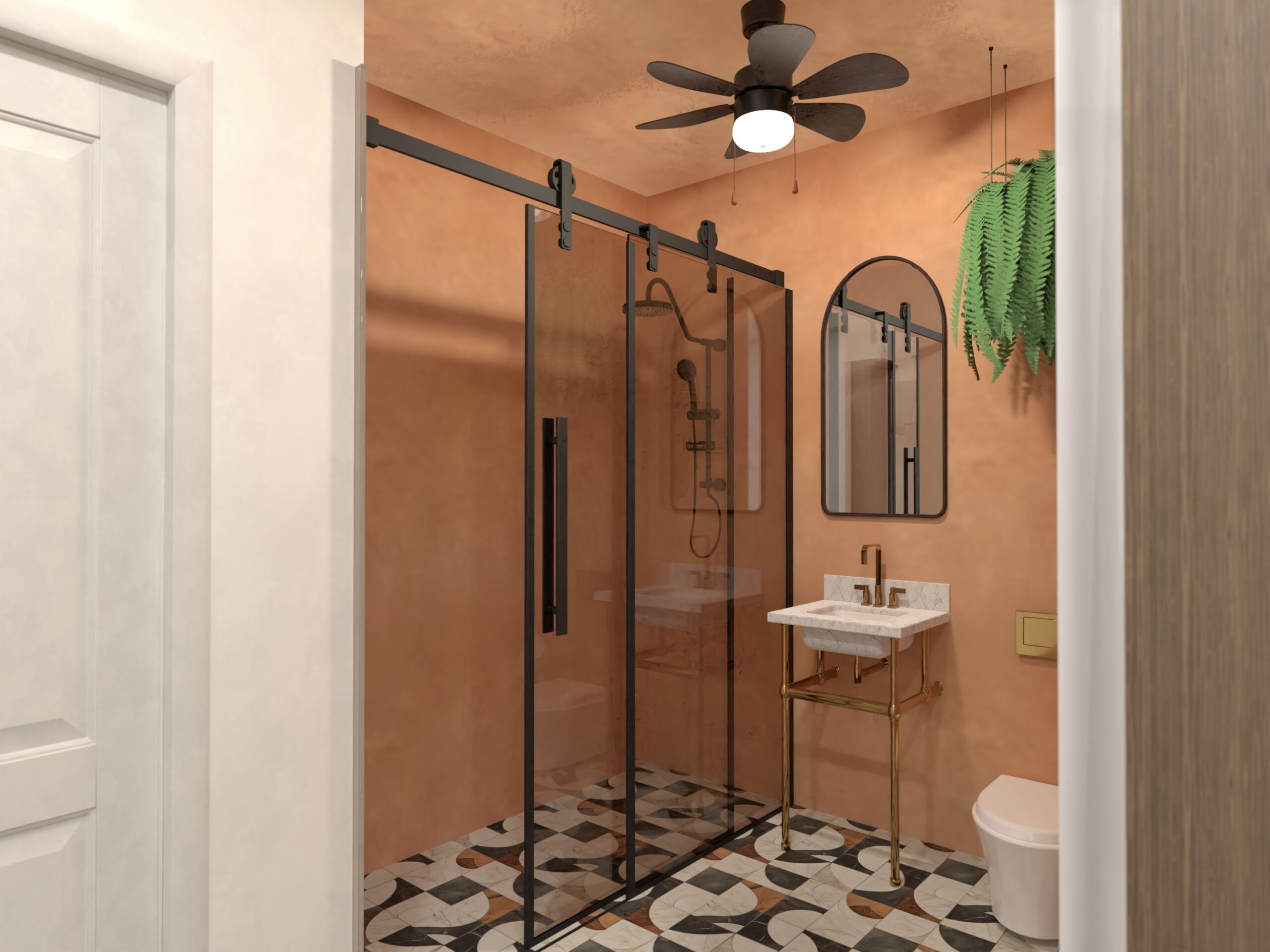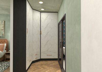 Baia privată este o reinterpretare modernă a stilului Art Deco: accente aurii, finisaje lucioase și o cadă sculpturală — un loc dedicat relaxării și creativității.