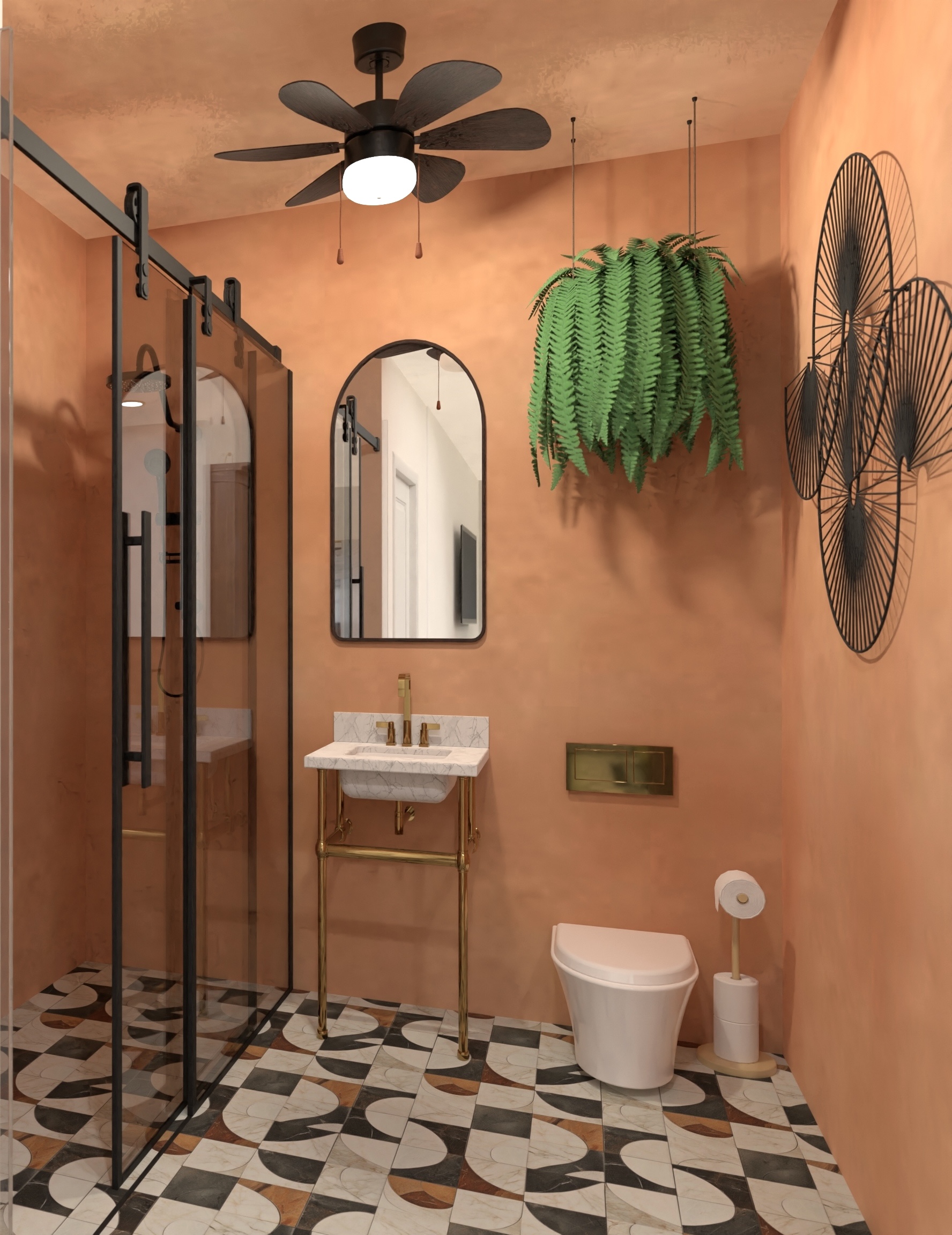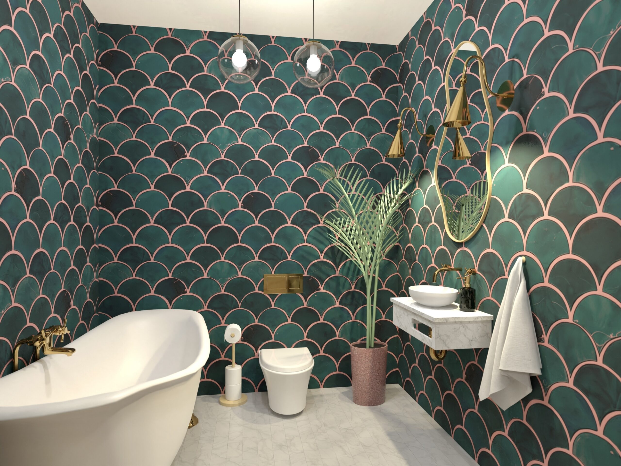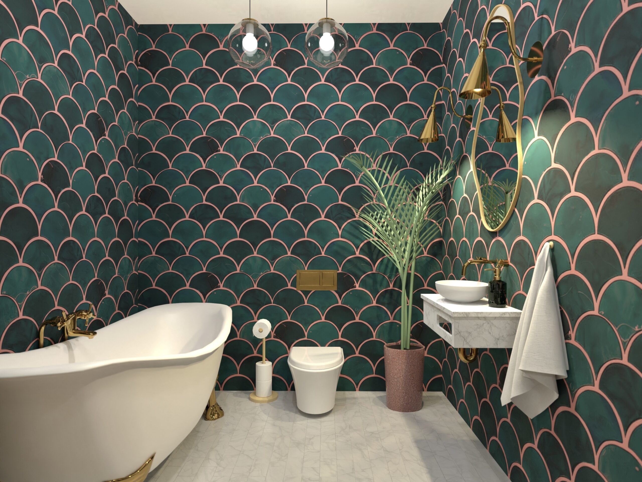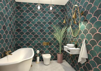 Este baia care iese puțin din convenție, aducând un aer vibrant și relaxant în același timp — un echilibru între funcționalitate și expresivitate.